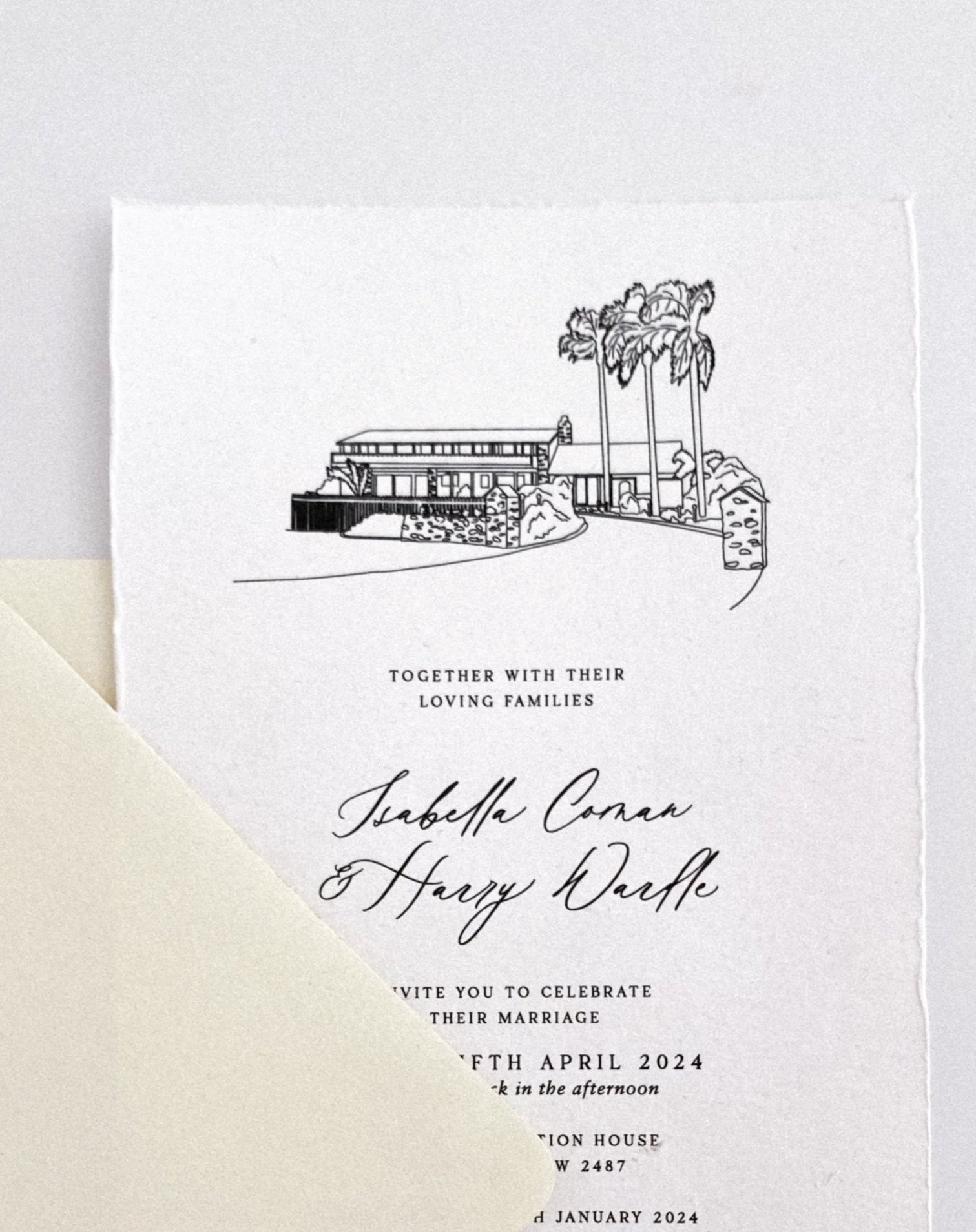 Line art illustration for invitations, signage or other wedding day stationery. Add an element of intimacy by customising your wedding experience with an illustration of your venue, your florals or something iconic to your love story.